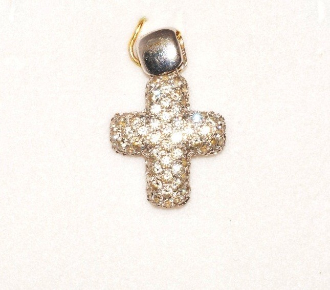 La cruz está fabricada con oro blanco de 18k, que es una aleación de oro de alta calidad que es duradera y resistente al desgaste. Cubierta de hermosas circonitas que hacen que destaque su brillo.